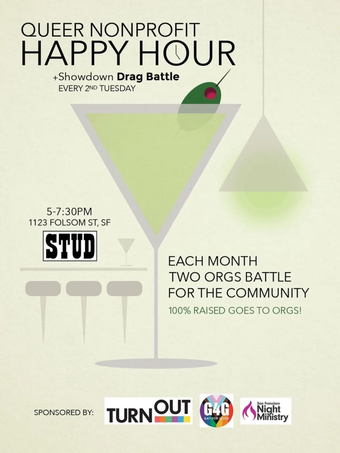 Come together for October’s Queer Non-Profit Happy Hour and Showdown Drag Battle at The Stud, Tuesday, October 14, 5-7:30PM!