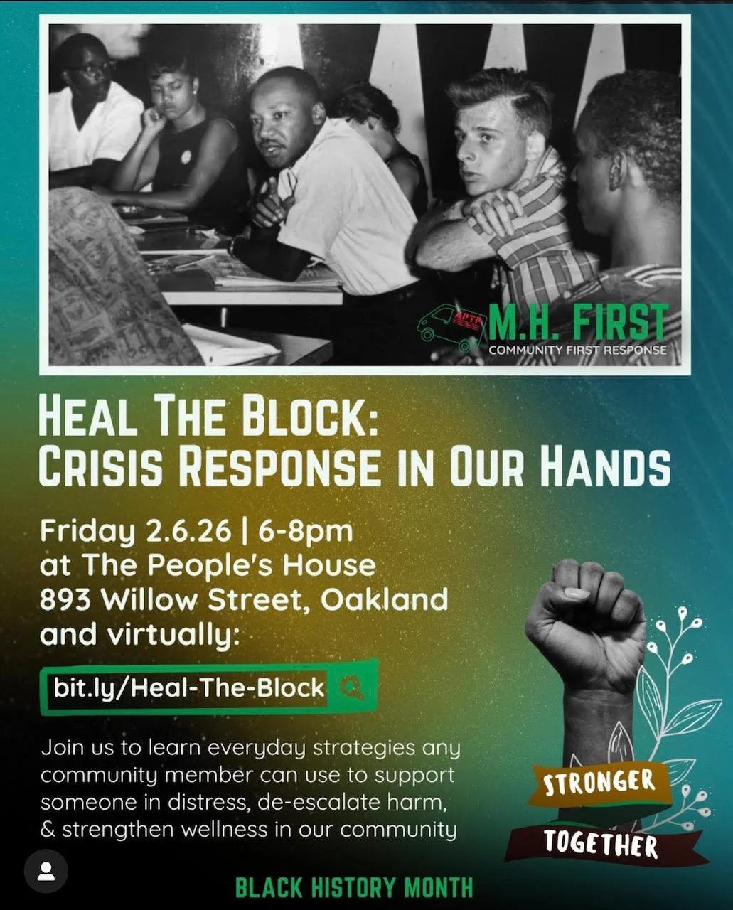 Healing the Block: An Alternative Approach to Crisis Response is a powerful community panel rooted in healing justice, mutual aid, and collective care. Together, we will explore how everyday people can respond to mental health crises, de-escalate harm, and strengthen wellness in our communities without relying on punishment or policing.