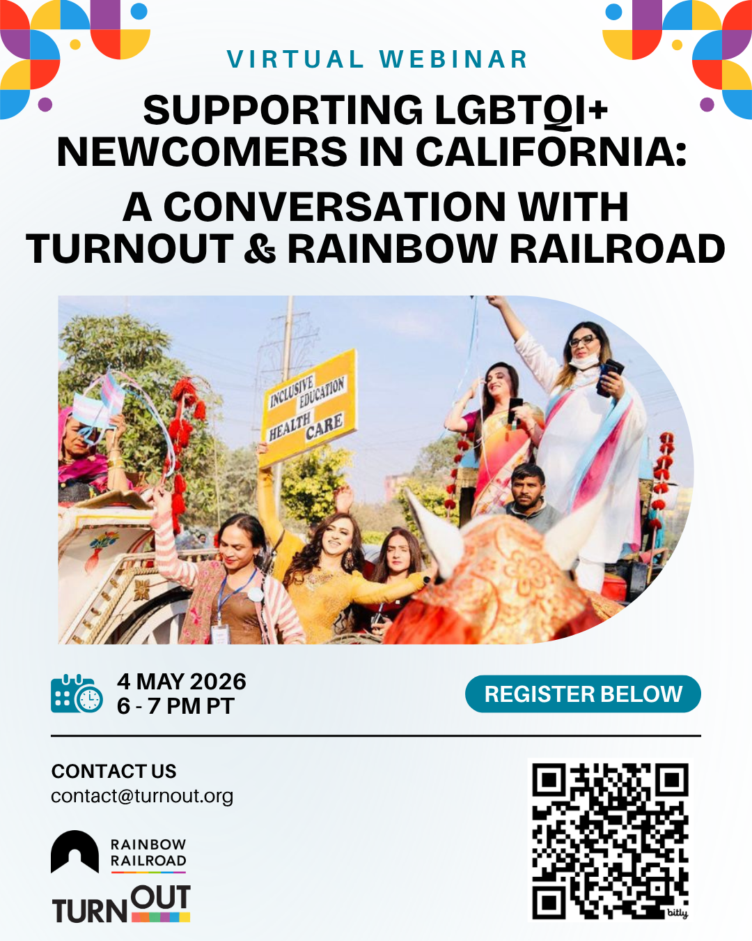 This Zoom session will offer practical ways to get involved locally—whether by joining a supporting a TurnOut community event or by forming a Rainbow Railroad Community Support Team (CST).