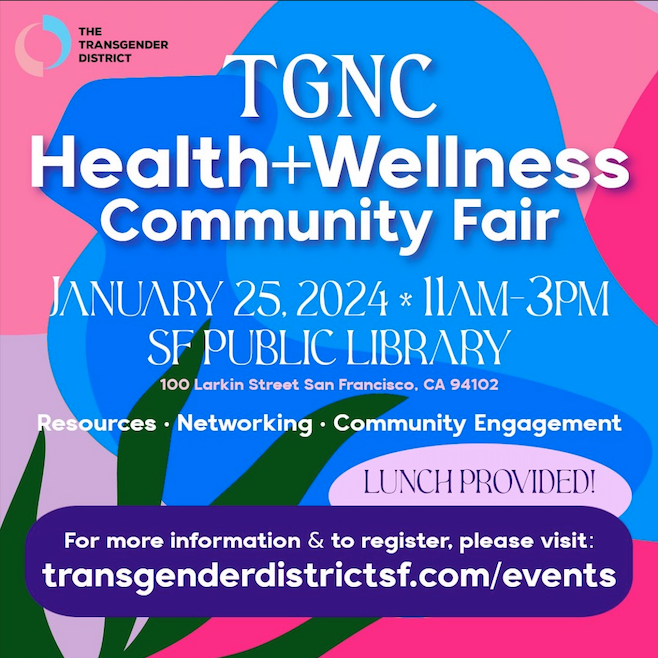 Attend the TGNC Health + Wellness Community Fair by the Transgender District! The event is on January 25th, 2024 from 11am to 3pm at the SF Public Library: 100 Larkin St, San Francisco, CA 94102