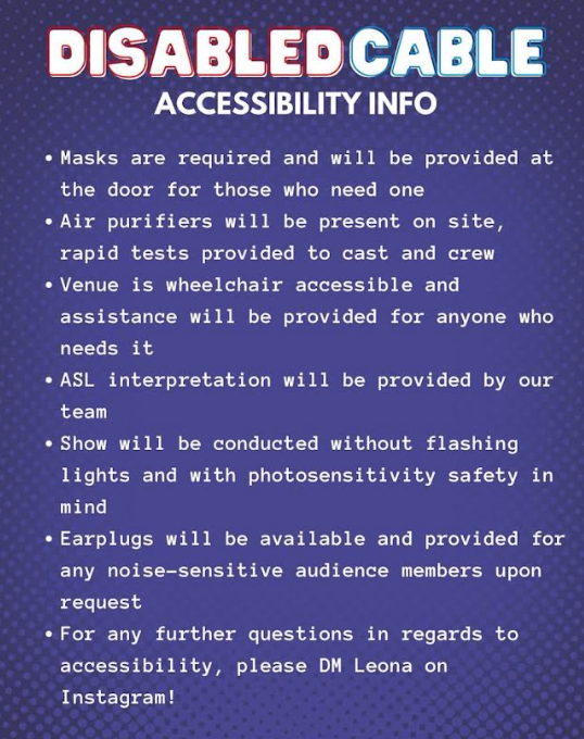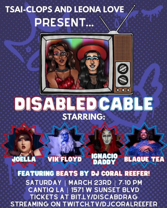 TUNE IN TO... DISABLED CABLE: An accessibility-forward drag show celebrating LA's disabled talent! Hosted and produced by Tsai-Clops and Leona Lionheart with co-stars Blaque Tea, Ignacio Daddy, Joella, and Vik Floyd!
